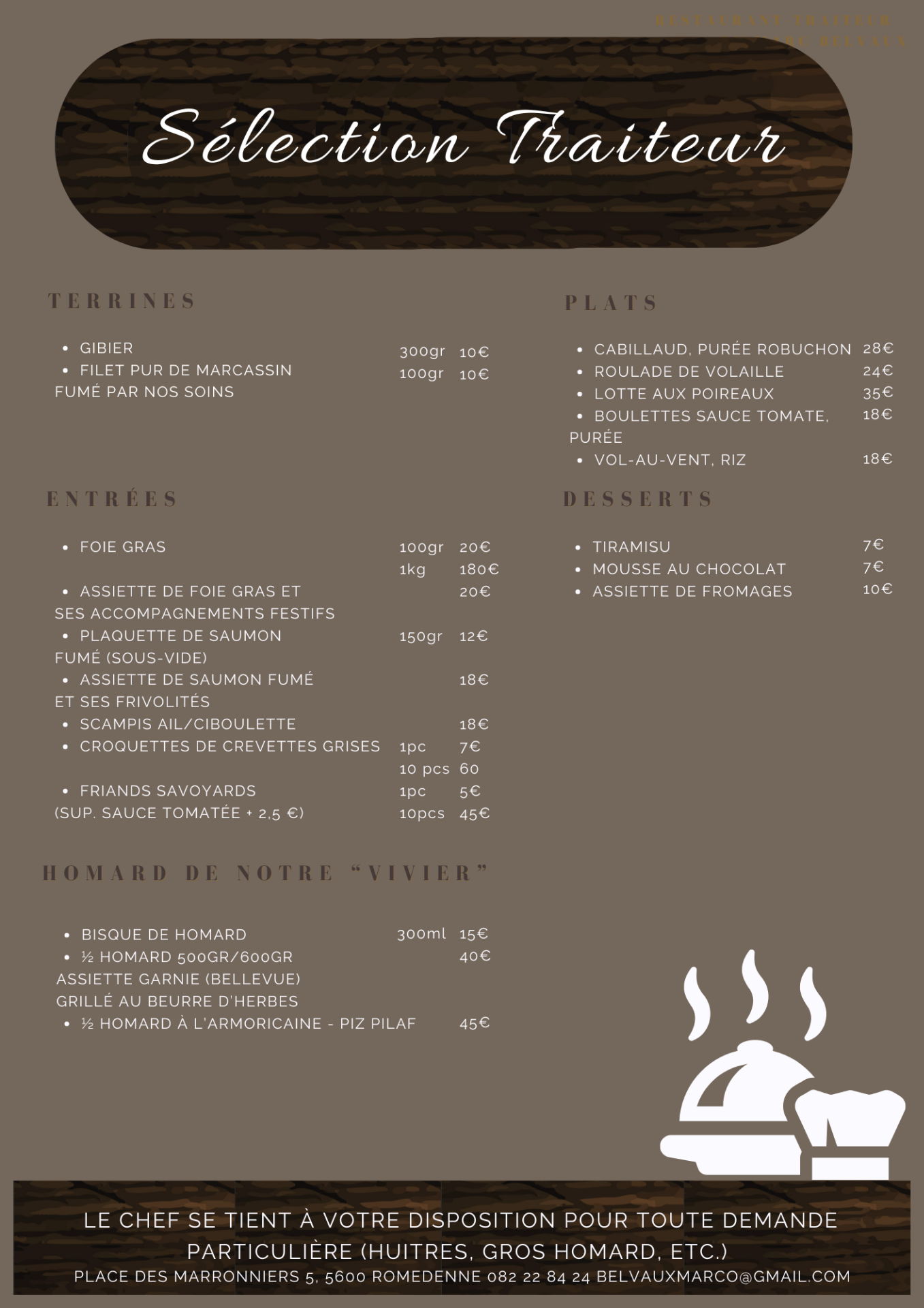 Pour vos évènements et repas de famille n'hésitez pas à contacter le chef quelques jours à l’avance si vous souhaitez un menu spécial.